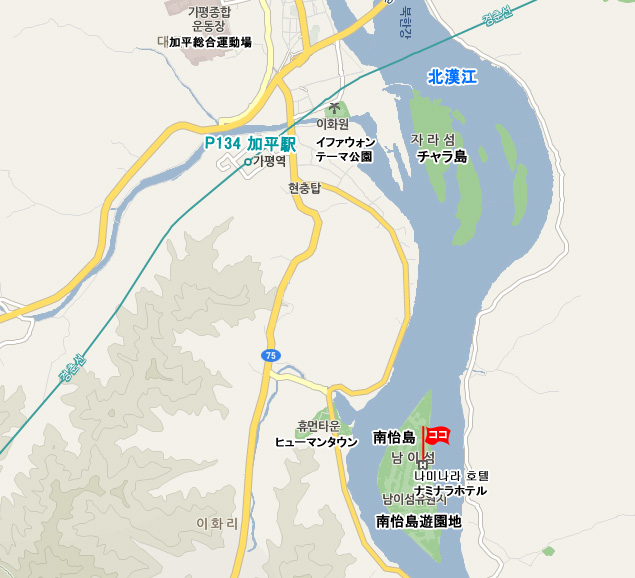 加平(ガピョン)駅から 南怡島(ナミソム)の船着場まで タクシーで 約10分。
