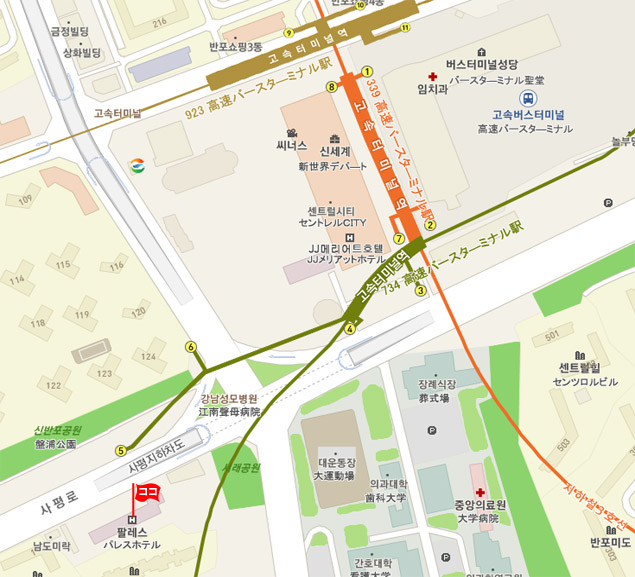 ♣ 仁川空港 ⇒ ホテル アクセス • KALリムジンバス : バス乗場:《第1T》3B 《第2T》19 運行間隔30分 所要時間 約70分 Route3A(江南行き/6703番)バスに乗り、ソウルパレスホテルにて下車。 • タクシー : 一般44,300ウォン、模範90,000ウォン程度 所要時間 : 約67分 ♣ 金浦空港 ⇒ ホテル アクセス • 地下鉄 : 金浦空港 (Gimpo Int’l Airport)から地下鉄9号線に乗り、高速バスターミナル(Express bus terminal)駅にて下車。5番出口から徒歩5分。 • 一般リムジンバス : バス乗場:国際線6番 国内4番 運行間隔15~20分 所要時間 約45分 6000番(蚕室:チャムシル方面行き)バスに乗り、高速バスターミナル(中央車路)にて下車。徒歩約15分。 • タクシー : 一般16,900ウォン程、模範50,000ウォン程、所要時間 : 約34分 ♣ その他 情報 • チェックイン 15:00、 チェックアウト 12:00 • NHKなど衛星放送 受信可。 • Wi-Fiなし、有線LAN接続(全客室有、有料) • 徒歩 2分以内にコンビニあります。 • 現地の事情により予告なしに変更される場合もございます。あらかじめご了承ください。 • 予約の確認、変更依頼、取消はMy予約確認ページにて行えます。 • メール送受信状況の確認、お客様とハナビツアーとのメッセージのやりとりはMy予約確認ページ ⇒ メール送受信 にて行えます。 • 最終更新日 : 2019. 7.1