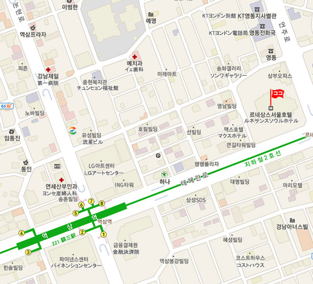 駅三(Yeoksam)駅にて下車。8番出口から徒歩約8分