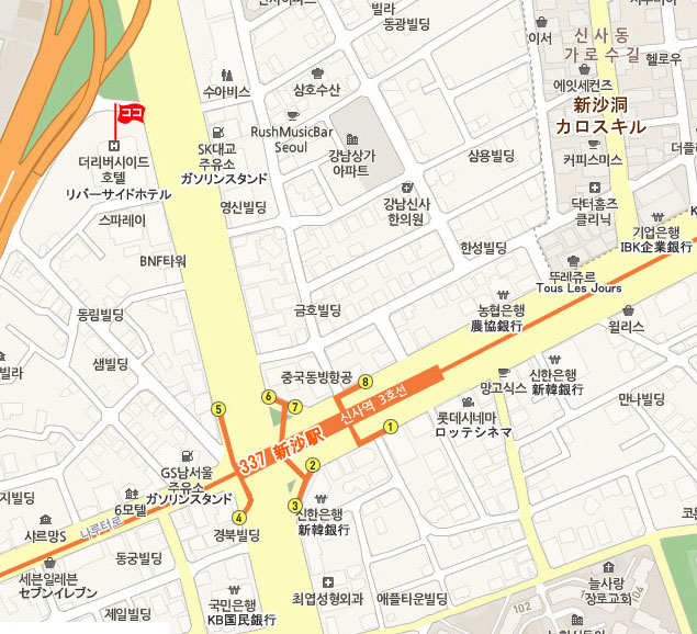 新沙駅(Sinsa)にて下車。5番出口から徒歩約5分