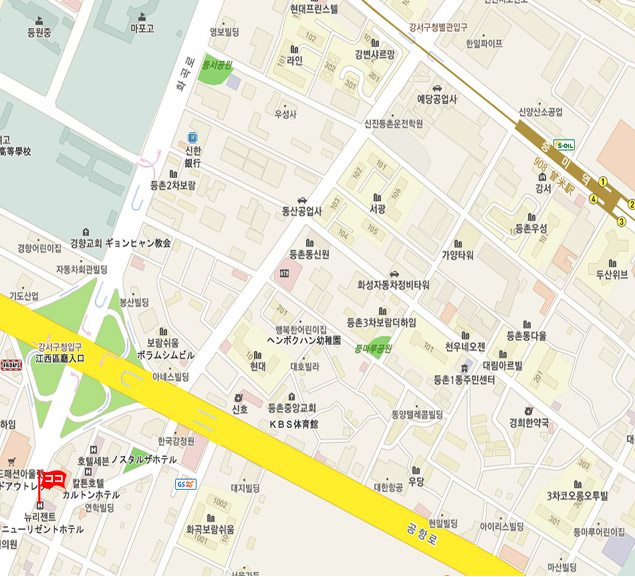 •  地下鉄金浦空港 (Gimpo Int’l Airport)から地下鉄9号線に乗車し、加陽(Gayang)駅にて下車。徒歩約8分。
