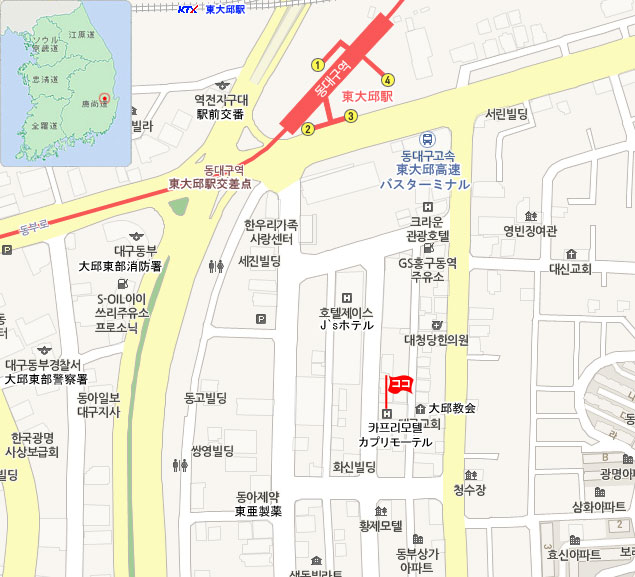 • 東大邱(ドンテグ)駅:徒歩で約5分所要