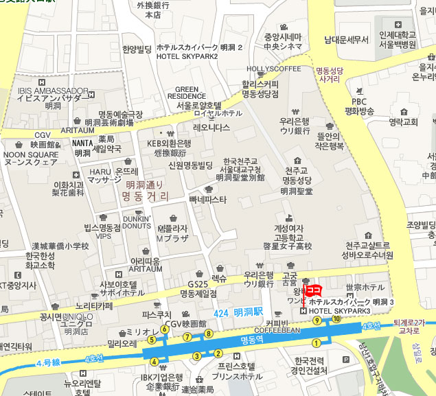 • 地下鉄 : 空港鉄道A`REXに乗車し、ソウル駅で4号線に乗り換えて明洞(ミョンドン)駅9番出口。