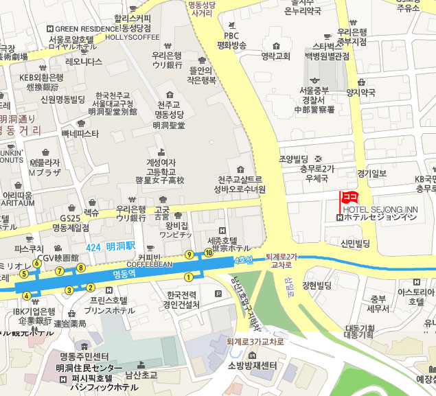 • 地下鉄 : 空港鉄道A`REXに乗車し、ソウル駅で4号線に乗り換えて明洞(ミョンドン)駅10番出口。