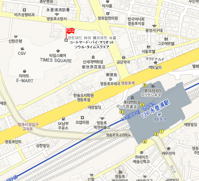 • 地下鉄 : 空港鉄道A`REXに乗車しソウル駅下車後、地下鉄1号線に乗換、永登浦駅5番出口方面の地下商店街を抜け地下直結通路利用。
