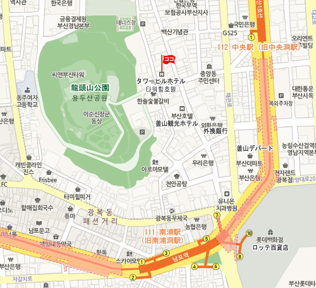 •  地下鉄から: 地下鉄1号線南浦洞(Nampodong) 5番出口より徒歩約2分。