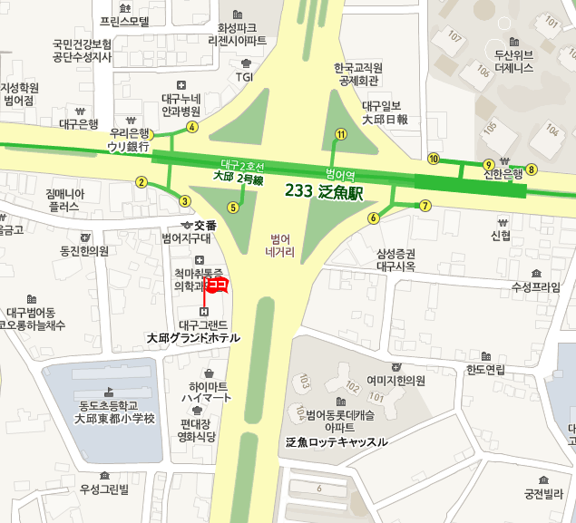 • 大邱地下鉄1号線東大邱(トンテグ、Dongdaegu)駅からタクシーで5分