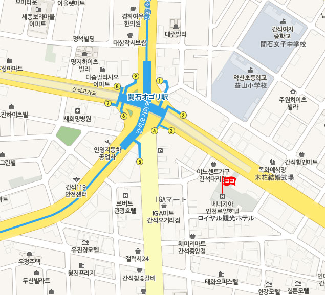 • 地下鉄駅から 地下鉄1号線トンアム(No.154 Dongam)南広場から 徒歩 約10分。