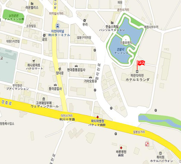 利川(イチョン)市外バスターミナルから ホテルまで 徒歩 約5分。