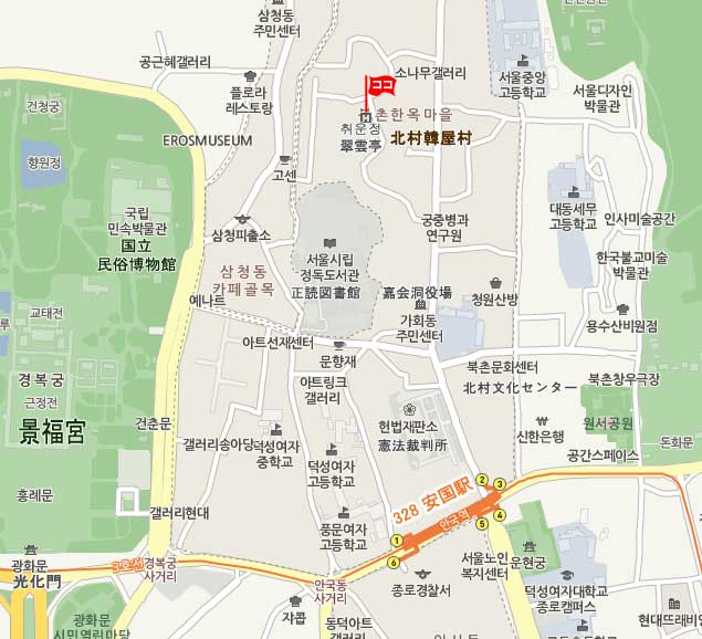 No.328安国(Anguk)駅で下車、2番出口から徒歩約15分。