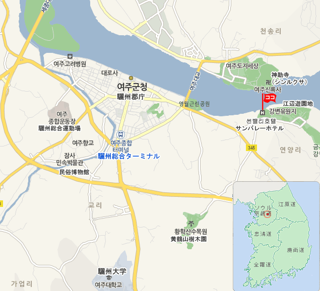 ソウル中心地から車で2時間弱の距離にある京畿道驪州(ヨジュ)は南漢江の豊かな水と清らかな自然に包まれた場所で白米や陶磁器の名産地としても知られています。韓国の文字ハングルを制定した朝鮮時代の名君.世宗(セジョン)の陵墓である英陵(ヨンルン)や、新羅時代に建立したと伝えられる神勒寺(シルルッサ)などの観光名所があり、週末にはソウルから小旅行で訪れる人々で賑わっています。また驪州一帯を流れる南漢江は【麗江】と呼ばれるほど美しい風景で知られています。