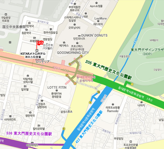 • 地下鉄 : 空港鉄道A`REXに乗車しソウル駅にて地下鉄4号線に乗り換え、東大門歴史文化公園にて下車。13番出口より徒歩約3分