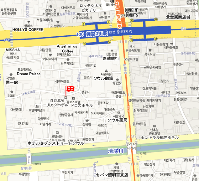 • 地下鉄 : 金浦空港 (Gimpo Intl Airport)から地下鉄5号線に乗車し、鍾路3街(Jongro (sam)-ga)駅にて下車。15番出口から徒歩5分。
