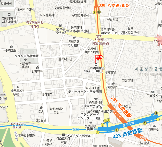 • 地下鉄 : 空港鉄道A`REXに乗車し、ソウル駅で4号線に乗り換え号線忠武路(Chungmuro)駅6番出口から徒歩約5分。
