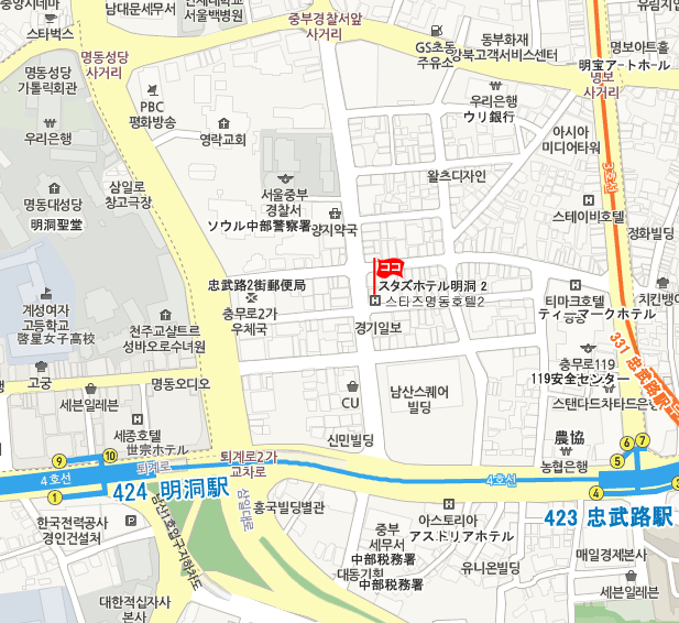 • 地下鉄 : 仁川国際空港(Incheon Intl Airport)から空港鉄道に乗車し、ソウル駅で4号線に乗換え明洞(Myeong-dong) 下車。10番出口徒歩10分。