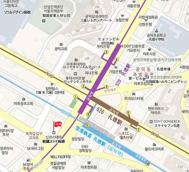 •  地下鉄 : 空港鉄道A`REXに乗車し、孔徳(Gongdeok.529)駅で下車、1番出口から徒歩約2分。