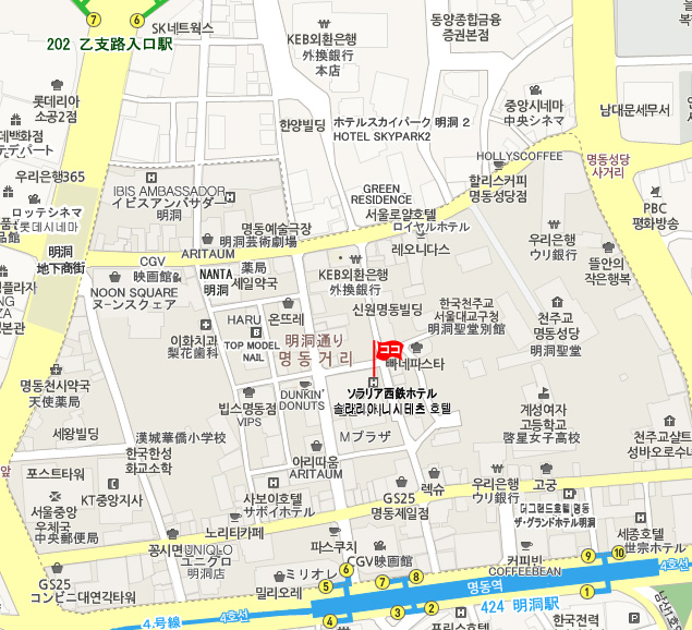 • 地下鉄 : 空港鉄道A`REXに乗車しソウル駅下車後、地下鉄4号線 明洞駅8番出口徒歩約4分。