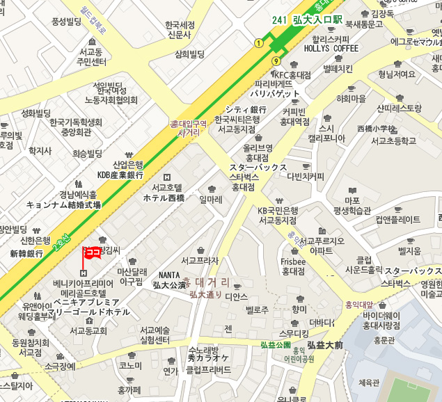 地下鉄 : 空港鉄道A`REXに乗車し、弘大入口駅(Hongik Univ.)駅で下車、9番出口から徒歩約8分。