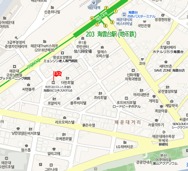 地下鉄から: 地下鉄2号線 海雲台(Heaundae)駅 5番出口より徒歩約4分。