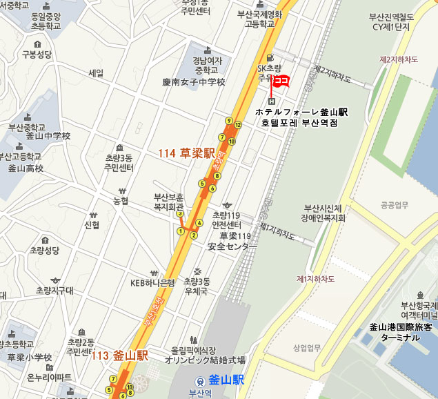 更に西面(Seomyeon)駅にて地下鉄1号線に乗換えて草梁駅(Choryang)駅にて下車。 12番出口より徒歩約3分。