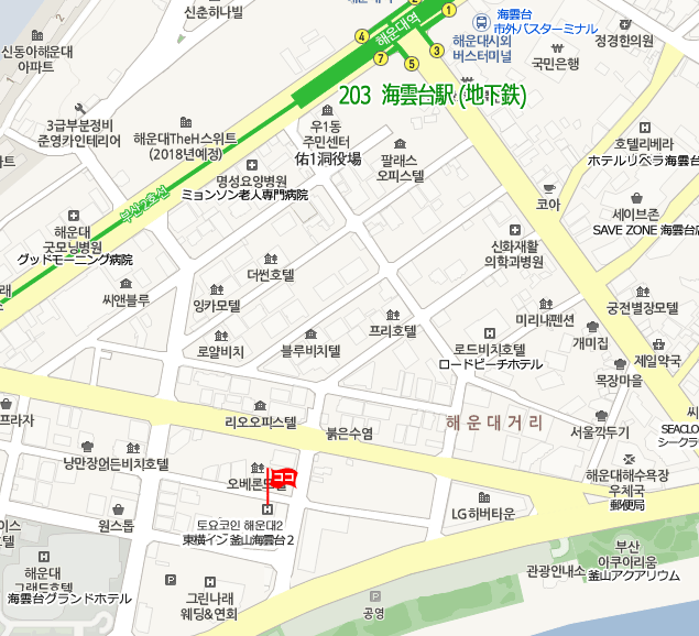 •  地下鉄から: 地下鉄2号線  海雲台(Heaundae)駅 5番出口より徒歩約10分。