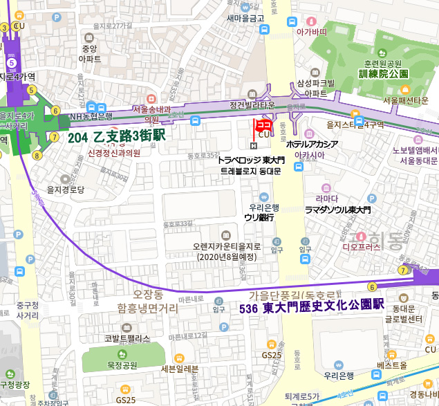 • 地下鉄 : 5号線 No.512 金浦空港 (Kimpo Intl Airport)駅からNo.535 乙支路4街(ウルチロサーガ)駅下車。
