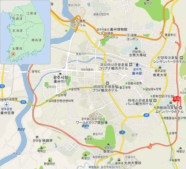光州(クァンジュ)総合バスターミナルからホテルまでタクシーで30分所要。