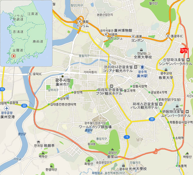 光州(クァンジュ)総合バスターミナルからホテルまでタクシーで20分所要。