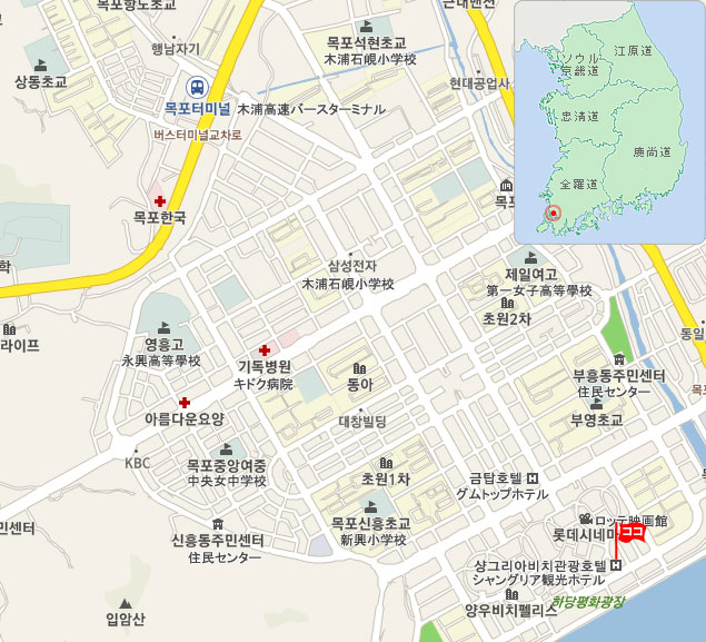 木浦(モッポ)バスターミナルからホテルまでタクシーで5分所要。