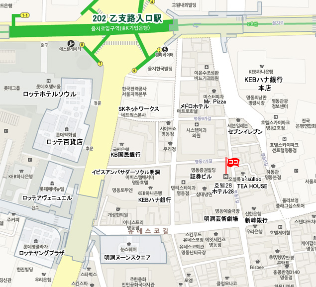 地下鉄 : 空港鉄道A`REXに乗車し、弘大入口駅で2号線に乗り換えて乙支路入口(ウルチロイック)駅5番出口から徒歩約5分。