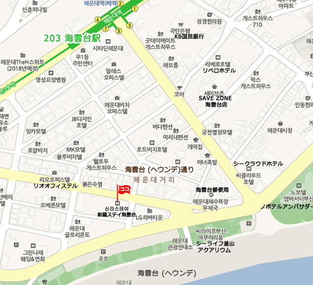 地下鉄から: 地下鉄2号線 海雲台(Heaundae)駅 7番出口より徒歩約7分。