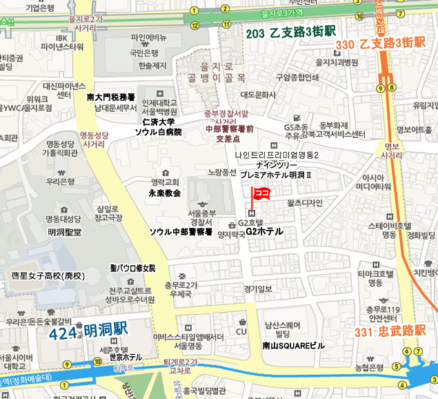 地下鉄 : 空港鉄道A`REXに乗車し、弘大入口駅で2号線に乗り換えて乙支路3街(ウルチロサムガ)駅5番出口から徒歩約6分。