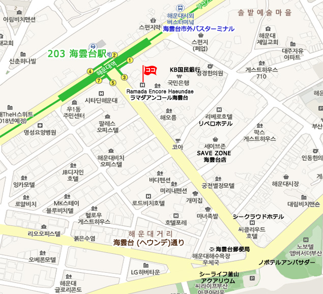 地下鉄から: 地下鉄2号線 海雲台(Heaundae)駅 3番出口より徒歩約1分。