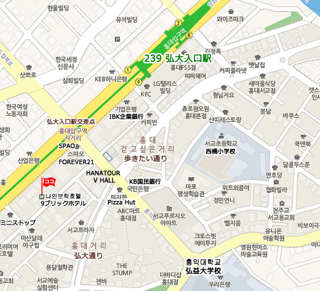 地下鉄 : 空港鉄道A`REXに乗車し、弘大入口駅(Hongik Univ.)駅で下車、9番出口から徒歩約6分。