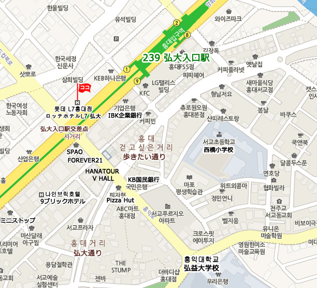 地下鉄 : 空港鉄道A`REXに乗車し、弘大入口駅(Hongik Univ.)駅で下車、1番出口から徒歩約5分。