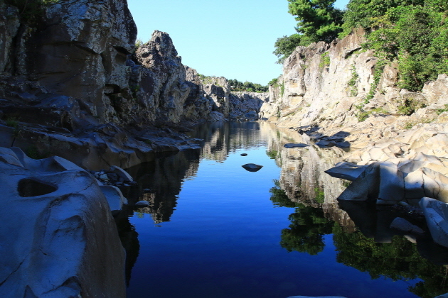 西帰浦にある、高さ22メートル、幅12メートルで、滝つぼの水深は20メートルという壮観を誇る天地淵瀑布。「天地淵」とは神の池という意味を持つ言葉で、玉皇上帝に使える7人の天女が玉の笛を吹きながら雲の階段を下りて地上に降りてきて、この池で沐浴をしたという伝説が残っています。ここは天然記念物163号にも指定されている膽八樹が自生しているところで、それ以外にも様々な珍しい植物や様々な木々が鬱蒼とした森を成しています。天然記念物379号として保護されているこの森に1キロの散策路があり、それに沿って歩くと滝にでます。