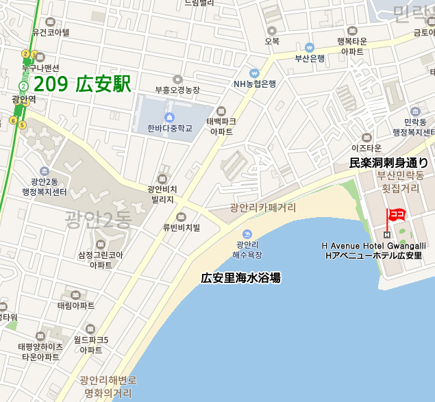 Hアベニュー広安里 ( H Avenue Hotel Gwangalli )ホテルは釜山第2のビーチとして人気の高い広安里(クァンアンリ)海岸沿いに位置し、釜山の海と夜景が美しい広安大橋を見渡すことができるエコノミーホテルです。夏の海水浴にぴったりな広安里ビーチはもちろん、BEXCOや釜山市立美術館、釜山メトロポリタン美術館、水辺公園、冬栢島、海雲台海水浴場など観光地に近く、また市内へもアクセス便利な位置にあります。スタッフのサービスには定評があり、清潔な客室とともに人気を集める魅力のひとつとなっています。