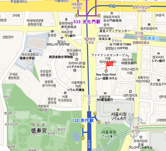 6701番 (市庁方面行き)バスに乗ってコリアナホテル前で下車後、徒歩約7分