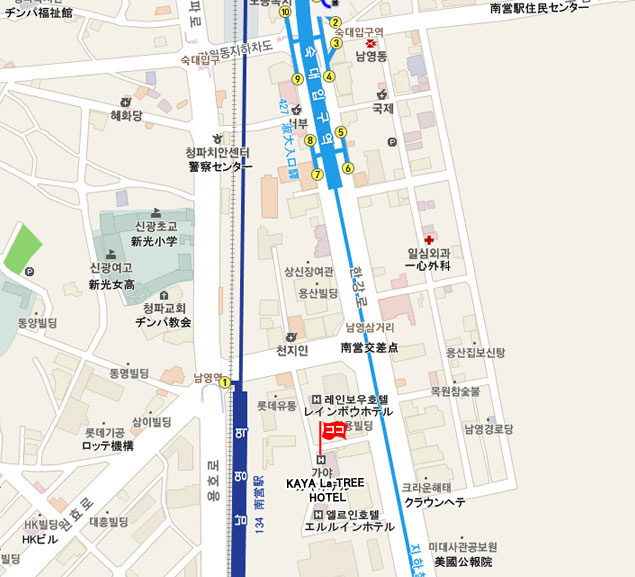 • 地下鉄 : ①金浦空港 (Gimpo Int’l Airport)駅から空港鉄道に乗り、ソウル駅にて1号線に乗換えて南営(Namyeong)駅下車。1番出口を出て約1分。
