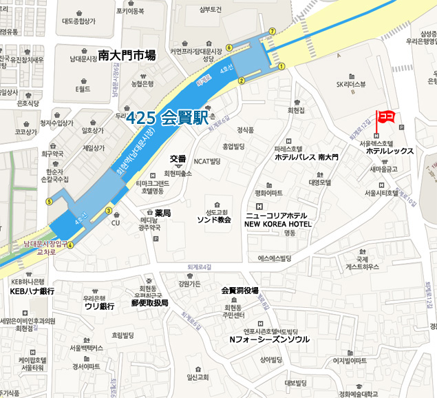 • 地下鉄 : 金浦空港 (Gimpo Int’l Airport)から 空港鉄道に乗車し、ソウル駅にて地下鉄4号線に乗換えて会賢(hoehyon)駅下車。1番出口からすぐ。