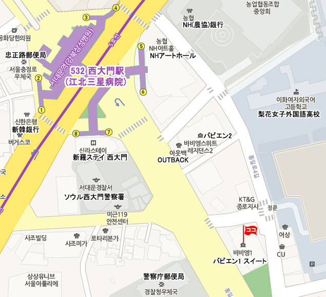 •  地下鉄 : 金浦空港 (Gimpo Int’l Airport)から地下鉄5号線に乗車し、西大門(Seodaemun)駅で下車。6番出口から徒歩約2分。