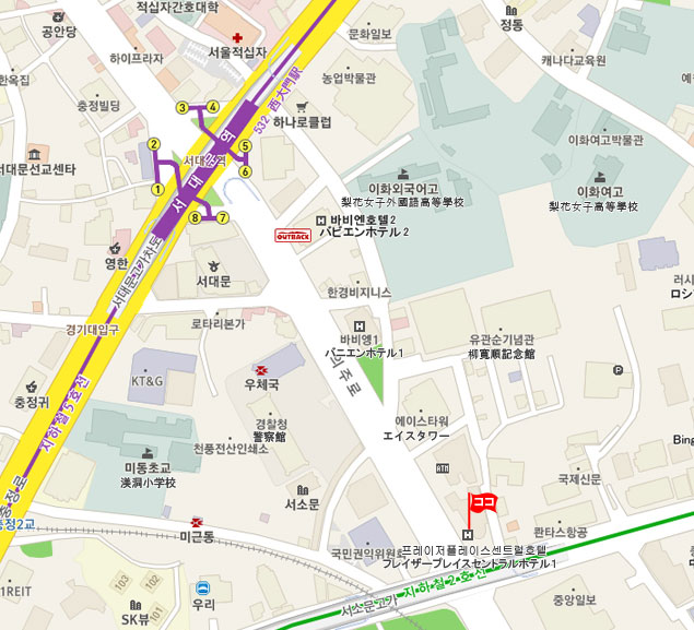 • 地下鉄 : 金浦空港 (Gimpo Int'l Airport)駅から地下鉄5号線に乗車し 、西大門(Seodaemun)駅で下車。 6番出口から徒歩約5分。