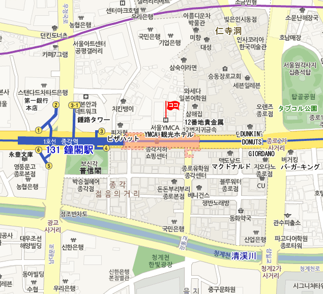 ♣ 仁川空港 ⇒ ホテル アクセス • 一般リムジンバス : バス乗場:《第1T》5B 《第2T》30 運行間隔:15分 所要時間:70分 6002番(清涼里行き)バスに乗り、鍾路2街(チョンノイーガ)で下車。徒歩約6分。 • 空港鉄道(A'REX) : 仁川国際空港(Incheon Int'l Airport)から空港鉄道に乗車し、ソウル駅にて地下鉄1号線に乗換えて鐘閣(Jonggak)にて下車。 3番出口から徒歩約2分。 • タクシー : 所要時間 : 約80分 ♣ 金浦空港 ⇒ ホテル アクセス • 地下鉄 :金浦空港 (Gimpo Intl Airport)から 地下鉄5号線に乗車し、鍾路3街(Jongro (sam)-ga)駅で下車。1番出口から徒歩10分。 • 市内バス : バス乗場:国際4番,国内6番 運行間隔:6~13分 所要時間:67分 601番(光化門行き)バスに乗り、鍾路2街(チョンノイーガ)で下車。徒歩約1分。 • タクシー : 所要時間 : 約40分 ♣ その他 情報 • チェックイン 13:00、 チェックアウト 12:00 ※YMCAビル正面入口は23時~翌5時半まで閉門。23時以降は裏門利用。 • NHKなど衛星放送 受信可。 • Wi-Fi(全客室有、無料、パスワードはフロントにて要確認)、有線LAN接続(一部客室のみ) • 朝食利用時は1階YMCAレストラン(8:00~9:00) • 徒歩 2分以内にコンビニあります。 • 現地の事情により予告なしに変更される場合もございます。あらかじめご了承ください。 • 予約の確認、変更依頼、取消はMy予約確認ページにて行えます。 • メール送受信状況の確認、お客様とハナビツアーとのメッセージのやりとりはMy予約確認ページ ⇒ メール送受信 にて行えます。 • 最終更新日 : 2020. 02. 18