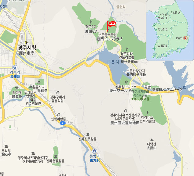 普門ゴルフクラブは、高級ホテルやゴルフ場、テーマパークが立ち並ぶ普門観光団地に位置するゴルフ愛好家ならどなたでも利用できる18ホール規模のパブリックゴルフ場です。22万坪を超える敷地に6270メートルの距離のコース(インコース:3288メートル、アウトコース:2982メートル)が造成され、照明設備も完備されていますので早朝や夕暮れのゲームにも支障はありません。慶州駅や慶州市内からも車で15分とアクセスも良好で移動の負担もありません。