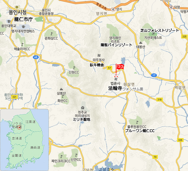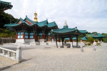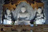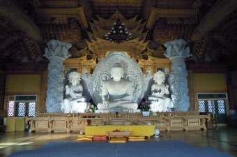 法輪寺はソウルから車で約1時間ほどの距離にある龍仁(ヨンイン)市にある勇壮な大きさを誇る美しい寺院です。神聖な山として古来から崇められてきた白頭山(ペクトゥサン)の赤松を建材とした大雄殿には白く輝く巨大な仏像が安置されています。この仏像は総重量53トンを誇り、その重量のため先に仏像を安置した後、大雄殿を建てたとされます。美しい庭のある境内には大理石で造られている三層石塔が静かに立っています。この石塔はソウル市内のある邸宅の庭に残されていたものが寄進されたもので、詳しい由来や年代ははっきりしませんが、その様式から新羅時代から高麗時代のものとされ、保存状態もよいことから文化財として指定されています。