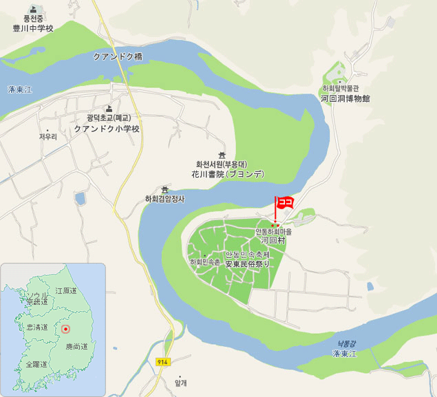 安東市豊山面に位置する河回村(ハフェマウル)は両班の屋敷や藁葺き屋根の小さな庶民の家が立ち並ぶ民俗村です。韓国国内にはいくつか民俗村がありますが、ここは山と川に囲まれた立地条件によって一度も戦火によって破壊されたことがなく昔のままの姿をそのままに残す唯一の民俗村として知られています。1993年にイギリスのエリザベス女王がこの村を訪問され世界的にも知られるようになり外国からの訪問者が増加しています。 この村は180家屋がある豊山柳氏の同姓村。一番の見どころは豊山柳氏の宗家である養真堂(宝物第306号)と、忠孝堂宝物第414号)。どちらも代表的な両班の屋敷である。河回村の特設公演場では3月から11月にかけ、仮面劇等もも行っている。