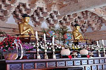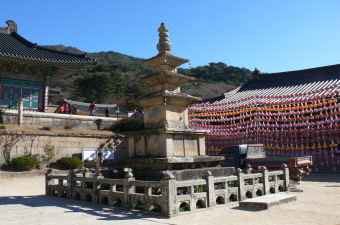 広大な境内には多数の伽藍や石塔があるが、度重なる戦火によって焼失、再建を繰り返し、大部分は李氏朝鮮末期に建て直されたもの。当時の姿を残すのは、木造毘盧遮那仏、憧竿支柱、三重の石塔のみ。