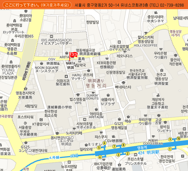 住 所   ソウル市 中区(チュング) 明洞2街(ミョンドンイーガ) 50-14番地 ユネスコ会館3階