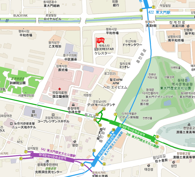 地下鉄 2·4·5号線の東大門駅 (No.205·422·536 トンデムンウンドンジャン・Dongdaemun Stadium) で降りて、駅14番出口を出て、徒歩 約7分所要。