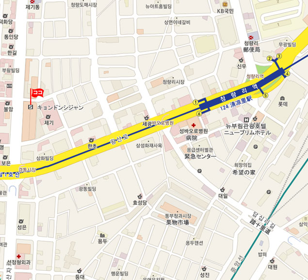 現地 アクセス         地下鉄 1号線の祭基洞駅 (No.125 チェギドン・Jegi-dong)で降り、駅2番出口を出て、徒歩 約3分